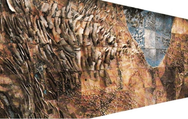 However, some of Duckworth’s best-known work was inspired by University of Chicago science faculty and their teaching tools – slides of clouds, topographic illustrations of Mount Fuji and NASA photos. These provided the inspiration for Earth, Water, and Sky, a large-scale mural commissioned in 1965 for the then-new Henry Hinds Laboratory for the Geophysical Sciences. The 400 square-foot glazed stoneware artwork, a campus treasure, graces the walls and ceilings of the building entrance.